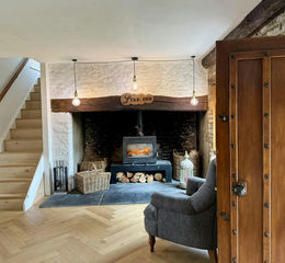 Entering from the front garden via a porch into a large dining hall with a stone inglenook fireplace - a fabulous entertaining space and which leads to the heart of the home which is the large open plan kitchen, garden room and sitting room all of which benefit from underfloor heating. The kitchen has a range of high-quality wooden cabinetry, together with a huge central island and integral appliances. From here you head into the beautiful garden room with a wood burner, stylish tiled floor and those wonderful views! Leading from the kitchen also is the large - yet still cosy - sitting room with views to the front garden and French doors out to the rear garden.