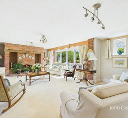 Adjacent and equally impressive, the expansive living room is bathed in natural light, thanks to full-height picture windows at the front and bifold doors at the rear that open onto the garden. At its heart lies a striking inglenook-style fireplace, complete with a raised hearth and rustic beam above-creating a warm and inviting focal point to this exceptional space.
