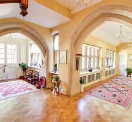 The main house extends to over 10,000 sq ft of elegantly proportioned accommodation, filled with natural light and period detailing. Grand reception spaces include an impressive entrance hall with stone fireplace and galleried staircase, a formal drawing room with south-facing French doors to the terrace, and a richly panelled dining room. The original billiard room has been transformed into a spectacular open-plan kitchen/dining/living space with a barrel ceiling, oak and flagstone floors, underfloor heating, a bespoke Smallbone walnut kitchen with integrated appliances, and a re-enamelled Aga—designed for both luxurious daily living and stylish entertaining.