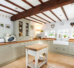 The travertine flooring continues into the kitchen which has exposed ceiling beams, and dual aspect windows to the front and side. It is fitted in a range of Wickes heritage painted units which include glazed display cabinets, a pull out larder, and pan drawers, and there is a matching island with additional storage and a butcher’s block surface. The wood block work surfaces incorporate a two ring electric hob, and a Villeroy and Boch two bowl butler sink with integrated draining area and an Insinkerator waste disposal. Other appliances include a built-in fridge, a new built-in dishwasher, and a Rayburn which provides the heating and hot water in addition to cooking.