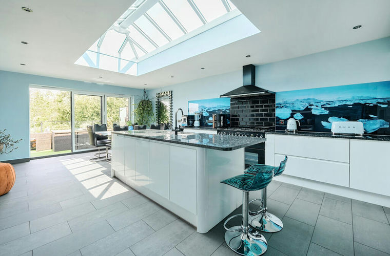 A hand built oak staircase leads up to the living accommodation on the first floor, with a spacious sitting room that enjoys a modern wood burning stove, a useful study, and bright lounge with bi-folding doors leading out to the balcony that overlooks the gardens and takes in the incredible views. The bespoke kitchen has been designed to an extremely high standard with granite work surfaces, large island, gas range, numerous integrated appliances and space for dining with additional bi-folding doors onto the balcony.