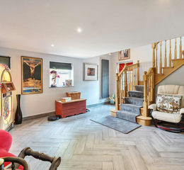 The house boasts secure entrance with electric gates and a large block paved driveway providing abundant parking for multiple vehicles. To the rear are the incredible and private 1.78 acres of garden, with patio area for outdoor entertaining, large areas of lawn, perfect for young children, mature trees, orchard, plants and shrubs, as well as an impressive water feature and multiple large storage sheds.