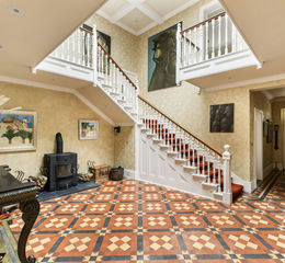 Interior:- A striking first impression is afforded by the imposing reception hall, which has a Victorian quarry-tiled floor, a lantern roof and a cantilevered staircase rising through the centre of the house. The rooms are well arranged off the reception hall, with the formal reception rooms positioned on the south-west side of the house to enjoy the finest views: the sitting room, drawing room, library and garden room all look out over the pleasingly symmetrical formal gardens. The kitchen is a modern addition completed in 2016 and incorporates elegant, white-painted cabinetry with premium Miele appliances and an expansive breakfast bar in a light-filled room perfectly appointed for family life. Adjoining the kitchen is a dining room, breakfast room, laundry and craft room, while there are further informal spaces for the family including a morning room, second craft room and a large boot room ideal for dogs. At cellar level there are useful wine stores and a boiler room. Upstairs, the six double bedrooms are arranged around a galleried landing; all bedrooms are ensuite, and the principal bedroom also has its own private balcony and dressing room.