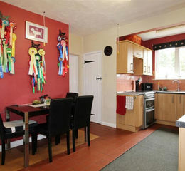 Kitchen/Breakfast Room - 4.99m (max) x 3.64m (max) (16'4" (max) x 11'11" (m - Textured ceiling. 2 x strip lights. uPVC double-glazed window to the side. Wooden-framed window to the side sun room. Fitted range of matching wall and base units with a worktop over and a tiled splashback. Stainless steel sink and drainer with a stainless steel mixer tap. Under-counter space and plumbing for a dishwasher. Free-standing 'Chesterfield' cooker. Serving hatch to dining room. Radiator. Power-points. Quarry tile flooring.
