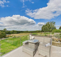 Outside, there are wrap around gardens, with one side featuring a lawn with a terrace and pergola providing excellent outdoor living and dining space. To the other side of the property is a further spacious lawned area, an ornamental pond and a home office which has power points and lighting, making for a beautiful place to work from home. Directly to the rear of the property, there is a raised sun terrace with bifolding doors to the main living area, and glass balcony which enjoys direct views over fields and beyond. To the front is a parking area for four to five cars with an EV charger.