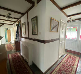 Hallway - Welsh slate flooring, storage cupboard, loft access, two radiators.