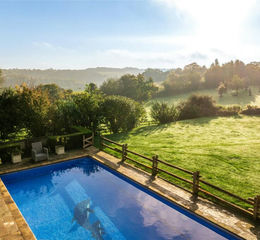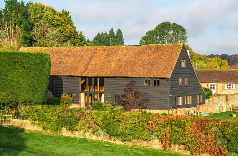 A Grade II Listed, 17th-century detached five bedroom barn conversion with a swimming pool, integrated and separate double garages and driveway parking, set in over 2.5 acres of garden and paddocks in an AONB on the edge of Naphill village overlooking open countryside. The converted 17th-century ash framed threshing barn on a flint and brick plinth has a mainly weatherboarded exterior beneath a clay tiled roof. The north side has a cat slide roof, interrupted by the original gabled cart entrance, the opposite double storey entrance in the sitting room is glazed. The building retains many period features, notably the internal exposed structural timbers, rising in the sitting room through three floors to the vaulted roof. The conversion has been done to a consistently high standard, there are handmade casement windows, ledge and brace doors, and a secondary hand-built spiral staircase (all oak). The conscientious design has repurposed an historic agricultural building to create a home with versatile family accommodation that is naturally lit and practical. The layout also takes full advantage of the far-reaching views over the easterly facing garden and paddocks, and the valley beyond.
