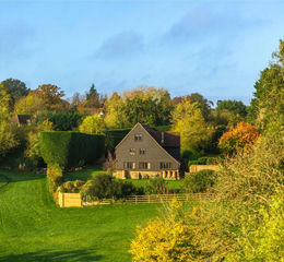 The barn is approached via a lane through a gap in mature, clipped leylandii hedging which leads to electric gates and a gate to the gravelled drive at the west end of the barn. (Timber gates in the drive open to the neighbouring house.) The leylandii continues along the border of the south side of the barn, sheltering the lawned garden, which has an inset herringbone brick path and planted borders along the barn walls. A gated, gravelled path from the drive drops five steps and follows the north wall of the barn to the garden. It is enclosed by a retaining brick wall with a laurel hedge and picket fencing. The main, easterly garden, accessed from both sides of the barn, overlooks the paddocks below and to the south and takes in the bucolic view across the valley beyond. The garden is laid to lawn with boundaries enclosed by beech hedging and shrub borders with post and rail fencing. There is a stone seating area designed for a firepit – and the view. The L-shaped (truncated)