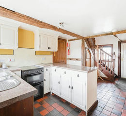 A fitted kitchen comprising one and a half bowl stainless steel sink and drainer set in a base unit; further base, drawer and wall units; complementary work surface; breakfast bar; double oven with hob; tiled flooring; exposed beams; windows to the front and rear elevations; stairs to the first floor accommodation; understairs storage; door leading to the rear garden; door into lobby; door leading into: