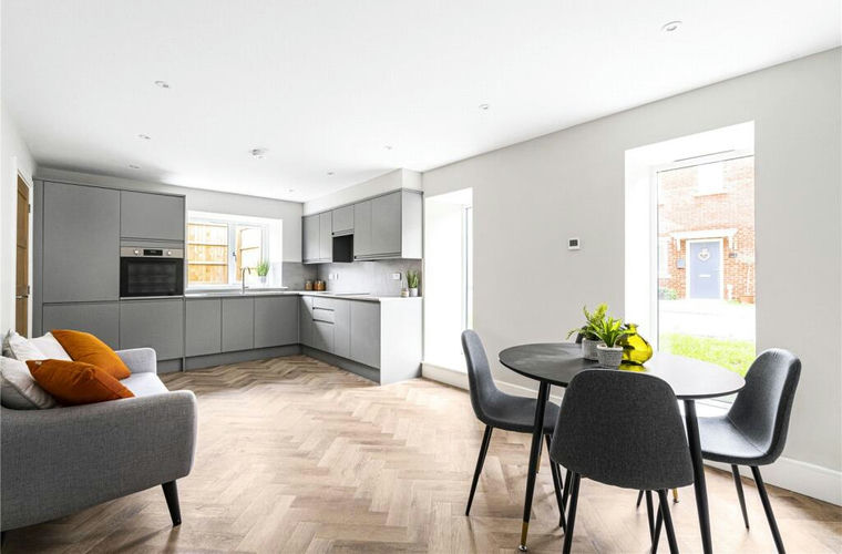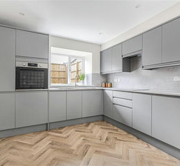 On the ground floor a well-proportioned dining kitchen, with contemporary fixtures and plenty of space for a good-sized dining table - great for everyday life or relaxed entertaining. The living room has a statement arched, glazed doorway opens onto the rear garden, bringing plenty of natural light and offering an easy connection to the outdoors. A beautifully fitted cloakroom and welcoming entrance hallway complete the ground floor. Upstairs, there are three generous bedrooms, including a principal bedroom with its own ensuite shower room, and a smartly appointed family bathroom. The interior balances clean, modern lines with the character of the exposed beams, creating a warm yet refined atmosphere throughout.
