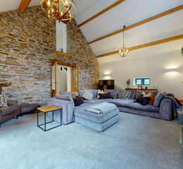 Beyond lies a superb utility room with a dog shower and downstairs WC, a thoughtful addition for practical family life. From here, the home flows through to a truly impressive vaulted living room, where exposed beams and double-height proportions create a spectacular yet welcoming space to unwind.