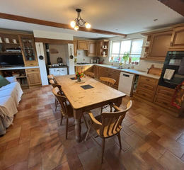 21' 7" x 18' 0" (6.58m x 5.49m) with fireplace incorporating a Rayburn Oil Fired Range. Fitted floor and wall cupboard with single drainer sink unit. 4 ring LPG gas hob, automatic dishwasher space, fan over and eye grill. Tiled floor.