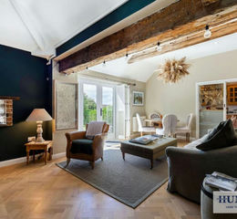 At the heart of the home lies a stunning sitting room, large yet cosy with vaulted ceilings, original brickwork, exposed beams, and an inglenook fireplace housing a multi-fuel stove. Newly installed French doors open onto the large rear garden, flooding the space with natural light and framing tranquil views of the garden.