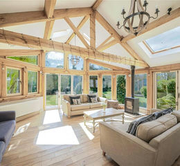 A further living area within the kitchen space, complete with a charming log burner, adds to the home's inviting character, creating an ideal spot to unwind while overlooking the scenic grounds. The principal sitting room is generously proportioned and bathed in natural light, elegantly finished in a serene, neutral palette.