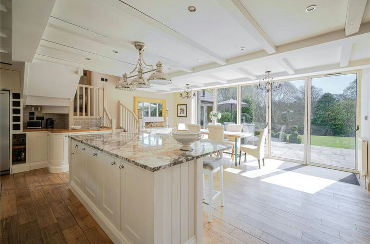 At the heart of the home lies an expansive, open-plan kitchen, dining area — a space that has been meticulously curated for both everyday living and entertaining. Bespoke cabinetry, granite and solid wood work surfaces, and rich hardwood flooring combine to create a warm yet sophisticated ambiance. Bi-fold doors open seamlessly onto the south-facing terrace, inviting the outdoors in and offering uninterrupted views across the manicured gardens.
