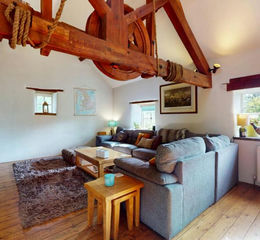 Lounge/Dining Room - 5.23m x 4.72m and 7.62m x 5.21m (17'2" x 15'6" and - A very spacious and versatile room with a high vaulted ceiling together with original A frame roof trusses, one incorporating a gear wheel associated with the water mill, exposed purlins, cottage style double glazed windows with deep sills, the principal windows to the front enjoying a pleasing southerly aspect over the gardens and rolling hills beyond. There is a fine stone fronted chimney breast with raised hearth and Villager cast iron stove, pine floorboarding, TV point, panelled radiators.