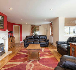 The lounge includes a large bay window that allows plenty of natural light, complemented by an electric fireplace, providing a comfortable setting for relaxation and entertainment. An additional sunroom offers a quiet place to unwind, secluded from the busier areas of the house. On the ground floor, two bedrooms share a bathroom with a separate shower.