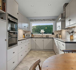 Bright and inviting, with dual-aspect windows embracing the leafy surroundings. Integrated NEFF ovens, ceramic NEFF hob and extractor, a large BOSCH fridge and BOSCH dishwasher sit alongside generous cabinetry and under-cupboard lighting. Space for a dining table. Door through to another utility.