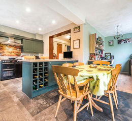 - Modern kitchen with range of high and low level cupboards, range cooker, dishwasher, fridge, space for dining table and bi-fold doors to garden