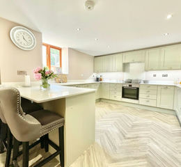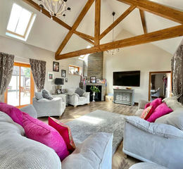 Drive through the secure gated entrance and onto the expansive gravel driveway, offering ample parking for family and guests. Step inside and discover a home where modern design meets timeless character. Be instantly introduced into the spacious dining room where this entertaining haven begins to sprout with the living room and kitchen located close by. The open-plan vaulted living area, enhanced by exposed wooden beams and an abundance of natural light from large windows, creates a grand yet welcoming space for family gatherings, while the heart of the home is the contemporary kitchen, featuring stylish cabinetry, quartz worktops, integrated appliance, breakfast bar and elegant herringbone style flooring, perfect for both culinary adventures and casual dining. A downstairs cloakroom makes things that even more practical and convenient.