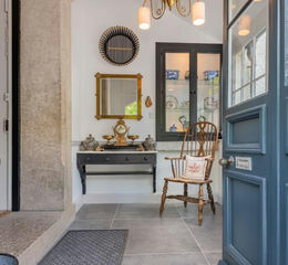 An ancient Cedar of Lebanon frames the lawn, as you first glimpse this handsome home with symmetrical sash windows and a stately stone portico. Arts and Crafts-style windows grace the porch, offering a warm and characterful welcome as you step inside.