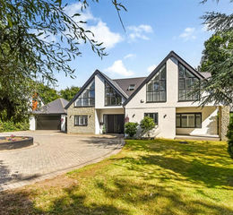 Occupying a plot of just over an acre, the property is approached via a sweeping driveway that provides extensive off-road parking and leads to a double garage. The frontage is framed by mature shrubs, established trees, and neatly maintained lawns, creating a striking first impression.