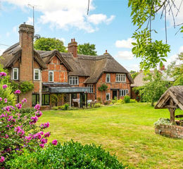 A Grade II listed 1911 village reed thatched house in a 17th-century style on a 0.29-acre plot with lawned gardens, a swimming pool, outbuildings, a garage and off street parking in a conservation area. Situated in a conservation area in a small Buckinghamshire village, the property appears to be a 17th-century, timber framed merchant’s house with brick infill beneath a hipped thatched roof. It was in fact designed by an Edwardian architect who used his architectural expertise to reconfigure a house from three derelict 17th-century cottages. The result is a house that has the robust practicality of a family home from the early 20th-century, with decorative features from three centuries earlier. It has leaded casement windows in wooden mullions and patterned brickwork, the main reception rooms have reclaimed 17th-century structural spine and ceiling beams, wooden panelling and one has a carved stone fireplace surround. Over the past 18 years, the current owners have sympathetically restored the house, updated the bathrooms, and extended at the rear to create a contemporary open plan kitchen area as well as building a swimming pool with an air source heat pump. (Listing no. 1288506.)