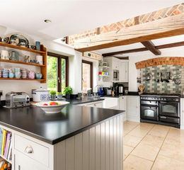 Some time ago a two storey west wing in the same style was added to the rear; the current owners converted the beamed ground floor room into a kitchen with windows overlooking the garden and added a contemporary lead-roofed open plan living area with Kloeber bi-folds on two sides opening to the patio and garden. To increase natural light, they included an L-shaped skylight (also revealing the patterned brickwork above), and wet under floor heating beneath limestone floor tiles. The kitchen has bespoke Shaker style base and wall units and a peninsular, all with Silestone worksurfaces and upstands and an inset double Belfast sink. A brick arched mantel with an extractor and a Fired Earth tiled back has space for a range style cooker; there is a larder cupboard. Included are an integrated dishwasher and a microwave (both Neff). There is space and plumbing for an American style fridge/freezer and ample room for a breakfast table and for seating in the family area.