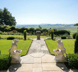 A stone flagged pathway leads from the gated entrance towards The Manor House, leading past three manicured lawn areas having mature planted colourful borders along with a stone-built pavilion.