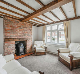 Cozy lounge complete with an exposed brick fireplace with clay tiles and space for a multi-fuel burner, wooden beams to the ceiling, and a solid-oak ledge-and-brace cottage door, creating a relaxing and homely feel. With carpeted flooring, a radiator, and a double glazed window to the front.