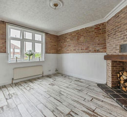 Featuring an exposed brick walls and fireplace with space for a multi-fuel burner, a dado rail, distressed wood-effect tiled flooring, Victorian plaster cornicing an archway through to the kitchen, a radiator, and a double glazed window to the front.