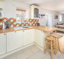 Upon entering, the welcoming entrance porch leads into a spacious hallway, where oak flooring flows throughout the main living areas. The heart of the home is the open-plan lounge, dining, and kitchen area, designed for both relaxing and entertaining. The country-style kitchen is fitted with a range of wall and base units, woodblock worktops, a ceramic sink, a gas-fired AGA range, a fridge freezer, a dishwasher, and a breakfast bar, all complemented by a window overlooking the rear garden. The generous living and dining space enjoys an abundance of natural light and offers direct access to the garden. Completing the ground floor is a separate utility room with additional storage, a stainless steel sink, tiled flooring, and a washer and dryer, alongside a convenient downstairs W/C.