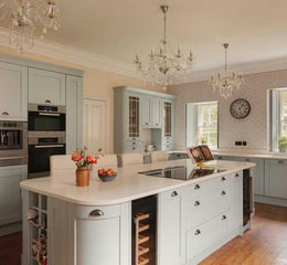 The dining kitchen is arranged for confident cooking and relaxed hosting. Hand finished cabinetry in a soft heritage tone and Corian worktops define a broad island with breakfast seating, the Neff induction hob set flush to keep the line clean. Along one wall, integrated Miele appliances provide twin ovens with combi and steam functions, while the island houses two wine coolers. A rear utility with its own external door keeps laundry and household storage out of the way and has direct access to the terrace.
