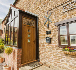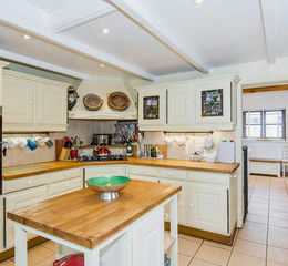 The property is entered through a recently added, wraparound glazed porch, leading into the central hallway. To one side lies a generously proportioned kitchen/diner featuring exposed beams, two-tone shaker-style cabinetry, a double oven, and a five-burner gas hob. Adjacent is a large utility room-added just three years ago-with vaulted ceilings, exposed V beam, ample storage, and direct access to the patio. A convenient WC is located off the utility.