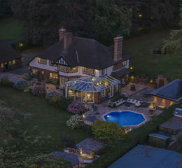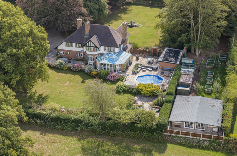 Externally the property is surrounded by manicured gardens extending to 1.2 acres with mature trees and allotment space. Various patio areas are sun traps by day and subtly lit by night with a pergola, heated swimming pool and sunken hot tub. A summer house with sliding doors provides covered seating and gym area.
