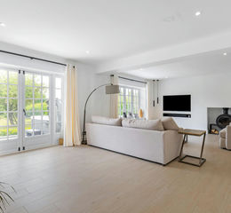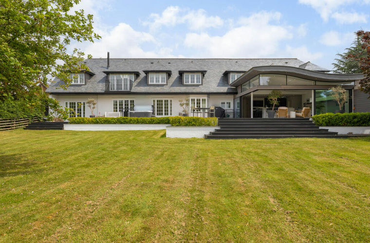 Fully remodelled by the current owners, the property offers a seamless blend of bold contemporary architecture and high-specification interiors, all set within over an acre of mature landscaped gardens. A key design feature is the wave-form roof crowning the glass walled kitchen pavilion – a striking ‘cube’ structure that commands views over the expansive grounds.