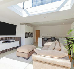 Stunning Open Plan Kitchen/Dining/Living - 6.48m x 5.26m (21'3" x 17'3") - Fabulous extended open plan stylish kitchen/dining/living space with a superb Lantern roof creating the 'Hub' for family living. Completed to a high specification with a comprehensive range of White gloss base and wall units with complimentary granite work surfaces & upstands. Inset stainless steel sink unit, integrated double oven, combination microwave and ceramic hob with feature wall mounted extractor above. Integrated dishwasher and fridge/freezer. Central Island. Under floor heating. Stylish wooden feature half wall with TV Media cabinet. Bi-Fold doors onto the rear patio and gardens.