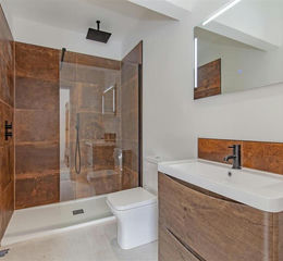 Exquisite En - Suite - 2.82m x 1.50m (9'3" x 4'11") - A splendid re-fitted en suite shower room which comprises of a 3 piece suite which includes a spacious walk in shower area with feature 'copper-tone' wall tiling, mains rainfall shower and additional shower hose attachment, low level WC and wash hand basin set within a stylish Walnut vanity cupboard. Anthracite heated towel rail.