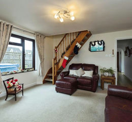 Back through to the main house, a well-appointed solid wood kitchen opens to a good size dining space with large doors opening to the rear garden. Again, space and light a key feature in this area. A cosy sitting room can be found along the hallway to the left which features a living flame fire. A staircase leads up to the first floor bedrooms, one with an ensuite wet room and the other currently used as an office. Superb views can be seen from most of the rooms in this property. The principal bedroom suite is on the ground floor and benefits from a neutrally decorated bathroom complete with separate shower. Ideal for any future proofing that may be required.