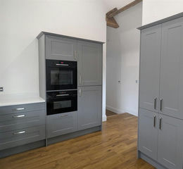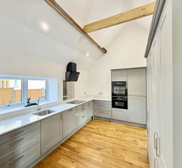 Kitchen - 3.93m x 2.92m extending to 4.12m (12'10" x 9'6" e - The property benefits from a newly installed kitchen with a range of floor and wall cupboards with sparkle quartz work surfaces incorporating a stainless steel sink unit with mixer tap. New Bosch integrated appliances consisting of integrated oven, microwave, hob with overhead extractor, fridge freezer and dishwasher. Solid oak floor with underfloor heating, vaulted ceiling with exposed beams and a double glazed window to the west elevation. Premium chrome switches and sockets.