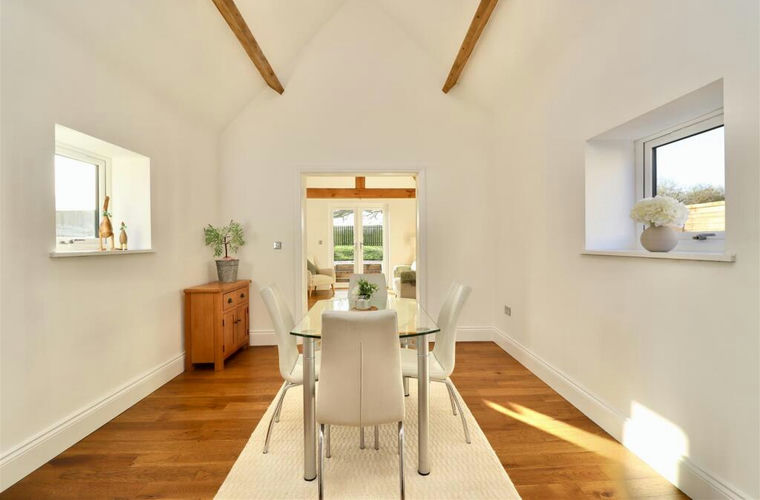 Dining Room - 3.26m x 3.63m (10'8" x 11'10" ) - A light and inviting space with double glazed windows to both the east and west catching the sun in the morning and the evening. A vaulted ceiling with exposed beams, solid oak flooring with underfloor heating and recessed lighting.