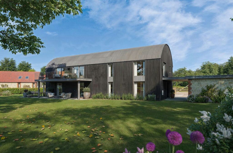 - Striking Dutch barn design with vaulted ceilings and open-plan living spaces. Generous private garden with far-reaching views.