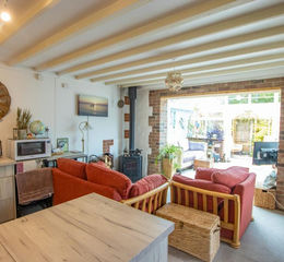 The barn provides open-plan ground floor living space which is full of character, featuring exposed brickwork, beamed ceilings and a wood burning stove which serves as the main focal point in the corner of the kitchen/living space. The kitchen comprises a collection of fitted storage units, with a sink and space for appliances. Beyond the living area there is an opening to the delightful garden room, which offers additional seating and dining space, with a glazed roof and double doors opening out to the garden.