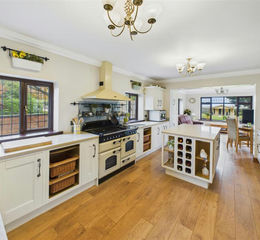 Kitchen - An open plan kitchen with an extensive range of country style cream coloured floor and wall mounted units complimented by quartz work surfaces. There is a range cooker with extractor hood above, grand island and space for an American style fridge freezer. A wide opening leads through to the sitting area and also a utilities area complete with matching fitted units and work surfaces, Belfast style sink with professional mixer tap, integrated dishwasher and plumbing for automatic washing machine. A door opens to the boiler room complete with two oil fired central heating boilers.