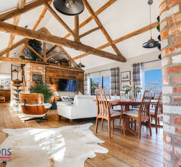 From the moment you step inside, the sense of light, space and craftsmanship is unmistakable. The heart of the home is an impressive open-plan living and dining space, where vaulted ceilings, exposed beams and original brickwork create an atmosphere of timeless charm. Two sets of wide patio doors frame panoramic vistas of the landscaped gardens and beyond, seamlessly blending the indoors with the natural beauty outside.