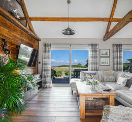 - Impressive open plan living space, featuring vaulted ceilings, exposed timber beams and original brickwork, and two large patio doors framing views across the gardens and beyond