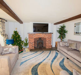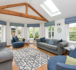 The principal sitting room includes a fine brick fireplace with a wood burner as a focal point, and ceiling beams. This room opens into a wonderfully light and airy triple aspect garden room with A-frame timbers, Velux roof lights, and French doors to a secluded patio. On the opposite side of the hall is the good-sized snug which overlooks the garden. From here, an inner hall offers useful cupboard storage, a well-appointed utility room and a downstairs WC with an eye-catching and quirky orange wash basin in a leaf design. The stylish and comprehensively fitted kitchen has a dual aspect with quartz worktops, an island unit and a sink unit with a 'five-in-one' Quooker tap. A host of integrated appliances include an induction hob with an extractor hood, three ovens, a grill, a full-height fridge, a separate freezer, and a dishwasher. The kitchen leads into the rear part of the hallway with a vaulted ceiling and a galleried landing. Beyond this is a spacious dining room with a wood burner and a beamed ceiling.