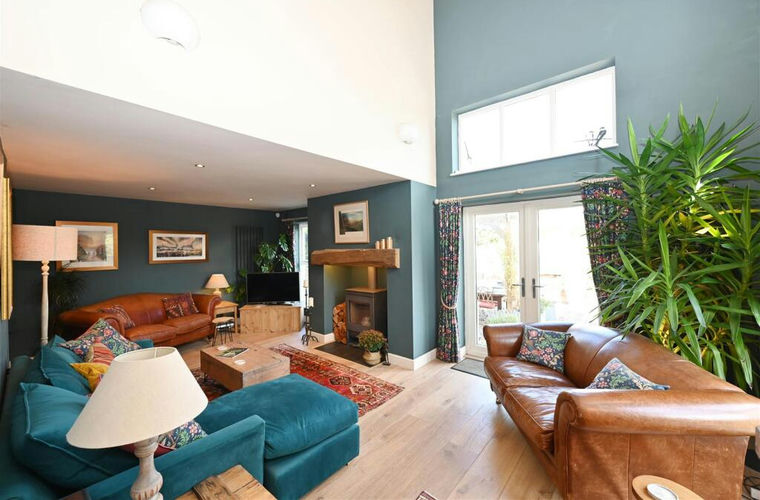 Part Vaulted Sitting Room (Views) - 7.02m x 5.90m max (23'0" x 19'4" max) - A gorgeous room with Oak finish flooring, wood-stove & down-lighting. Stacked windows to side & rear, & patio doors to rear. Open to: