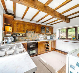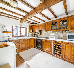 with Oak flooring, exposed timbers, radiator, fitted wall and base unit with laminate worksurface over, stainless steel 1 1/2 sink and drainer, integrated electric double oven and hob, windows to front and rear and door to: