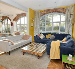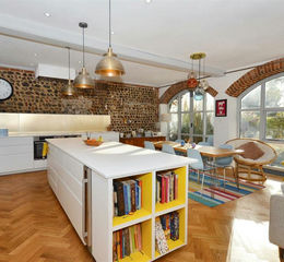 Kitchen/Diner/Family Room - A superb large open plan space with a white gloss range of kitchen base and drawer units with Corian work tops, built in double electric over with inset induction hob and extractor hood over. Built in dish washer, inset one and half bowl sink unit with hot tap and separate mixer tap. Separate large central Island with storage cupboards beneath seating breakfast bar area and matching white work tops, and three drop down lights over. Large space for dining table and chairs, exposed flint walling, three large full height arched windows and French doors to garden. Herringbone flooring, open plan to living area, TV point, inset spot LED lighting. Large wood burner on stone hearth.